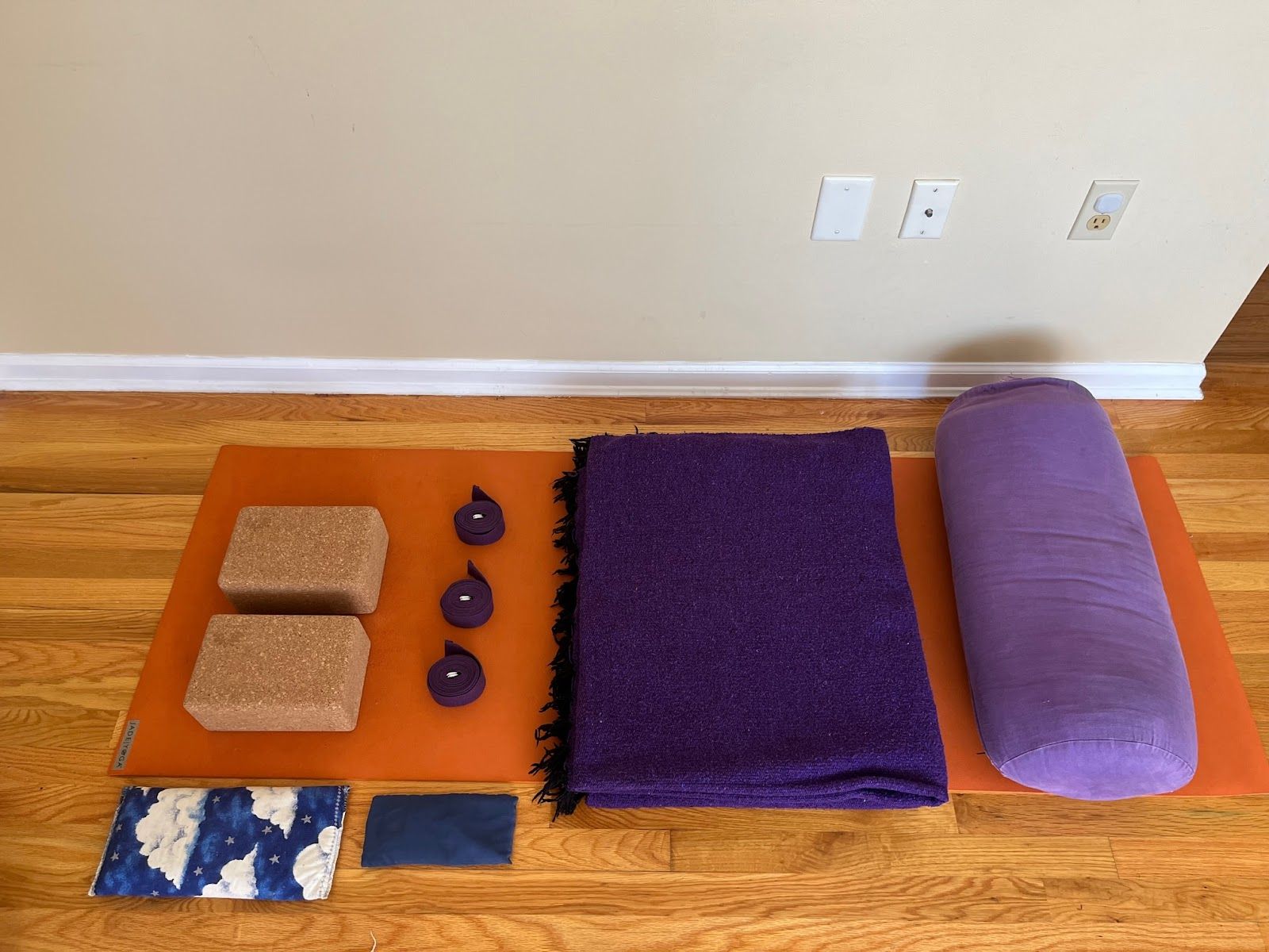 Props needed: yoga mat, bolster, 2 blocks, 2 blankets, eye pillow