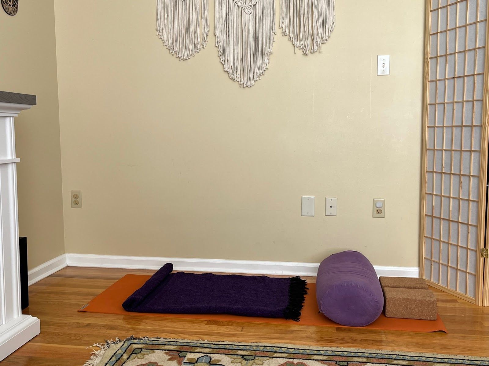 Adjust yourself as needed to find comfort with the neck roll, and optional eye pillow to help close the eyes, block out light, and turn your attention inward. The second blanket (not pictured) can drape overtop of you to keep you warm. If you cool easily, consider also wearing layers and socks to stay cozy and allow your complete relaxation.